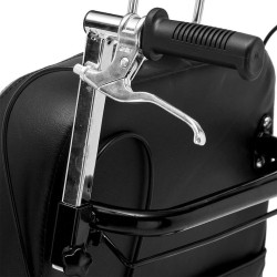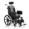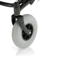 La roue avant est constituée d'un moyeu de roue en plastique avec des pneus TPR mesurant 200 mm de diamètre. En revanche, la roue arrière est une roue gonflable en plastique d'un diamètre de 620 mm. Le coussin de siège présente un dossier haut, recouvert de cuir artificiel et rempli d'éponge hautement élastique. Il offre également la possibilité de régler l'angle du dossier entre 160° et 170°, assurant une position assise confortable. De plus, les accoudoirs sont conçus pour être facilement mobiles et détachables pour un démontage sans effort.