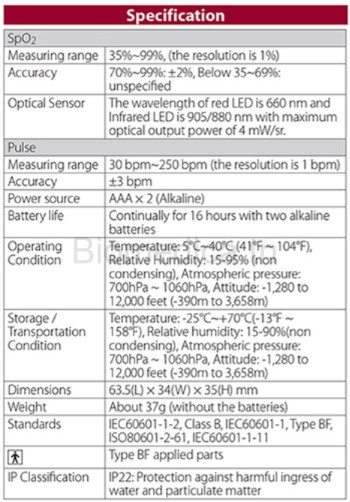 Grâce à l'indice ACT, la mesure de la SpO2 peut évaluer efficacement et sans effort la présence d'artériosclérose. De plus, cet appareil a la capacité d'évaluer la probabilité de troubles circulatoires périphériques ainsi que de maladies cardiaques et vasculaires. Les spécifications de l'Oxymètre de pouls Rossmax sont les suivantes.