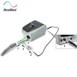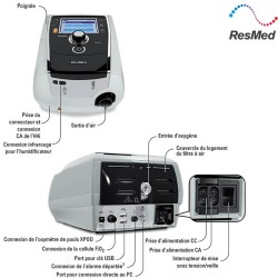 Cet appareil convient aux applications non invasives et invasives (en cas d'utilisation de la valve de fuite ResMed). Il peut être utilisé de manière statique dans un cadre médical ou à domicile, ou utilisé en ambulatoire, par exemple dans un fauteuil roulant.